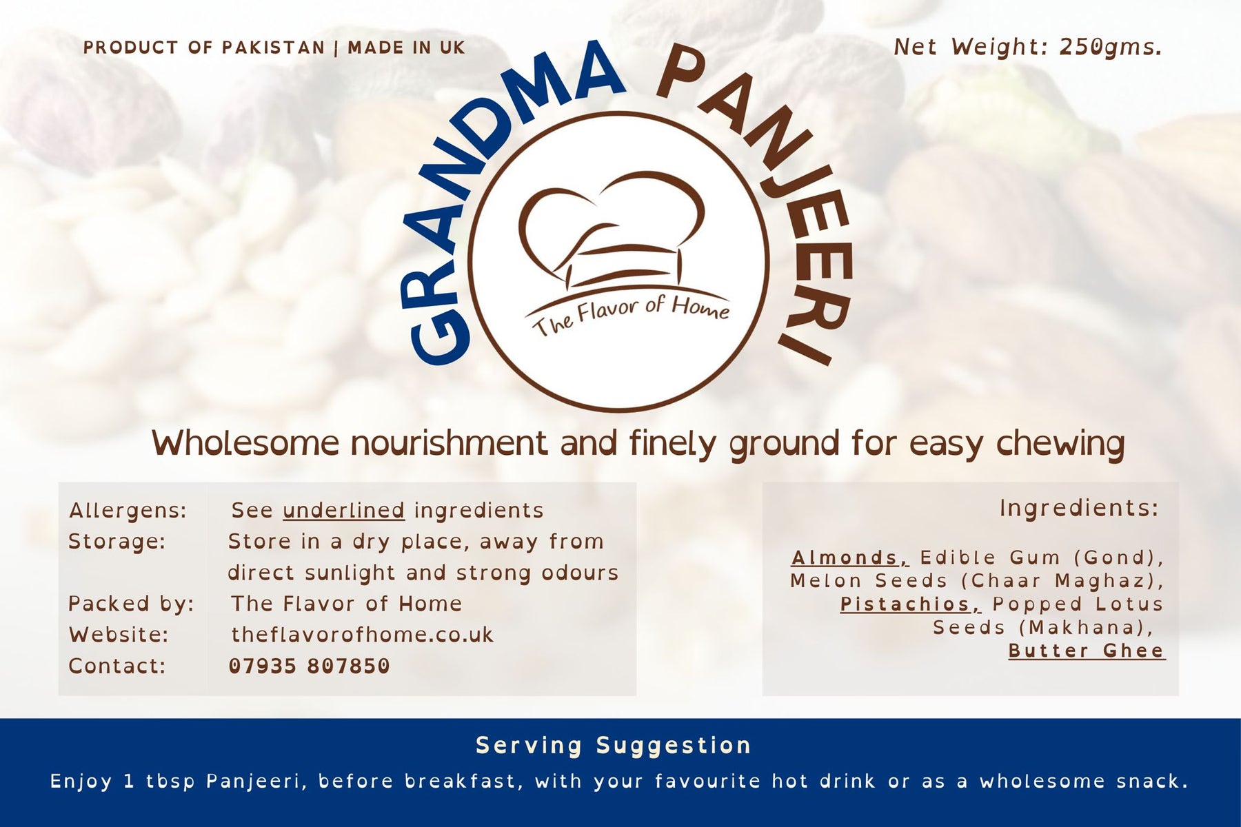 Crafted with premium-quality ingredients, Grandma Panjeeri is finely powdered for a soft, easy-to-digest texture—perfect for all ages. This nourishing blend supports energy, reduces fatigue, and helps strengthen the body. Sweetened naturally with Jaggery Powder, it offers both wholesome nutrition and a delicious traditional taste.